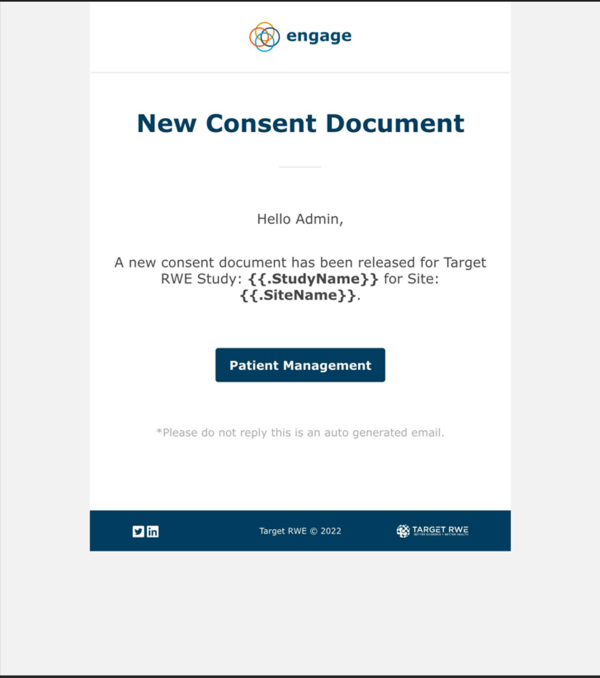 The Reconsent button is used when there is a new version of the consent document. The Site Admin can click this button to push a reconsent milestone to individual patients. Below is an example of a ‘Reconsent’ email that the participant will receive. The Site Admin will also receive a ‘New Consent’ email as seen below.