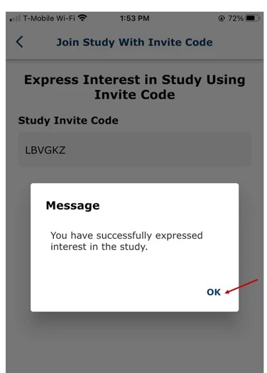 Once you express interest in joining a study, you will receive the below message and email. Once you press ‘OK’, you will see the study under ‘My Studies’.