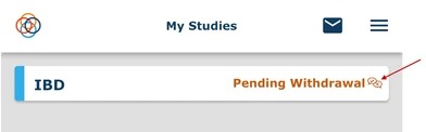 Once you enter a Reason for Withdrawal, if you press the ‘Confirm’ button, the study will display as ‘Pending Withdrawal’. At this point, the Research Coordinator will review and acknowledge your withdrawal. Once the Withdrawal is acknowledged by the Research Coordinator, your Enrollment Status will change to ‘Inactive’.