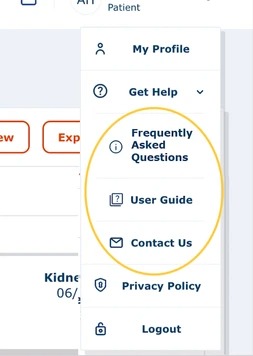 You can navigate to the ‘Get Help' screens by clicking on the Patient Name to expand the dropdown and then clicking on the ‘Get Help’ dropdown. This will give you the option to read the ‘Frequently Asked Questions’, ‘User Guide’ and ‘Contact Us’ if necessary.